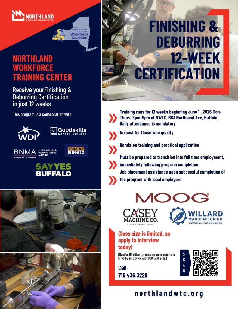 Northland Workforce Training Center (NWTC) is launching a 12-week program that will prepare new and incumbent workers with the skill set necessary to enter the field as a Finisher/Deburrer. The curriculum for this program was developed in collaboration with NWTC’s industry partner, Moog, Inc.